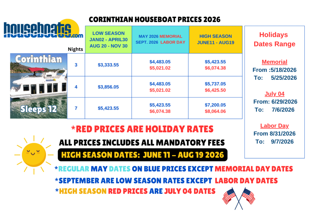 Designed to comfortably accommodate 12 guests (with a maximum capacity of 14), The Corinthian is perfect for family gatherings, reunions, or a fun-filled trip with friends. With ample space, luxurious amenities, and the stunning backdrop of Shasta Lake, every moment aboard The Corinthian will be cherished for years to come. Don’t miss out on the vacation of a lifetime. Book the Corinthian Houseboat at Shasta Lake today and start making memories that will last forever! BOOK HERE NOW