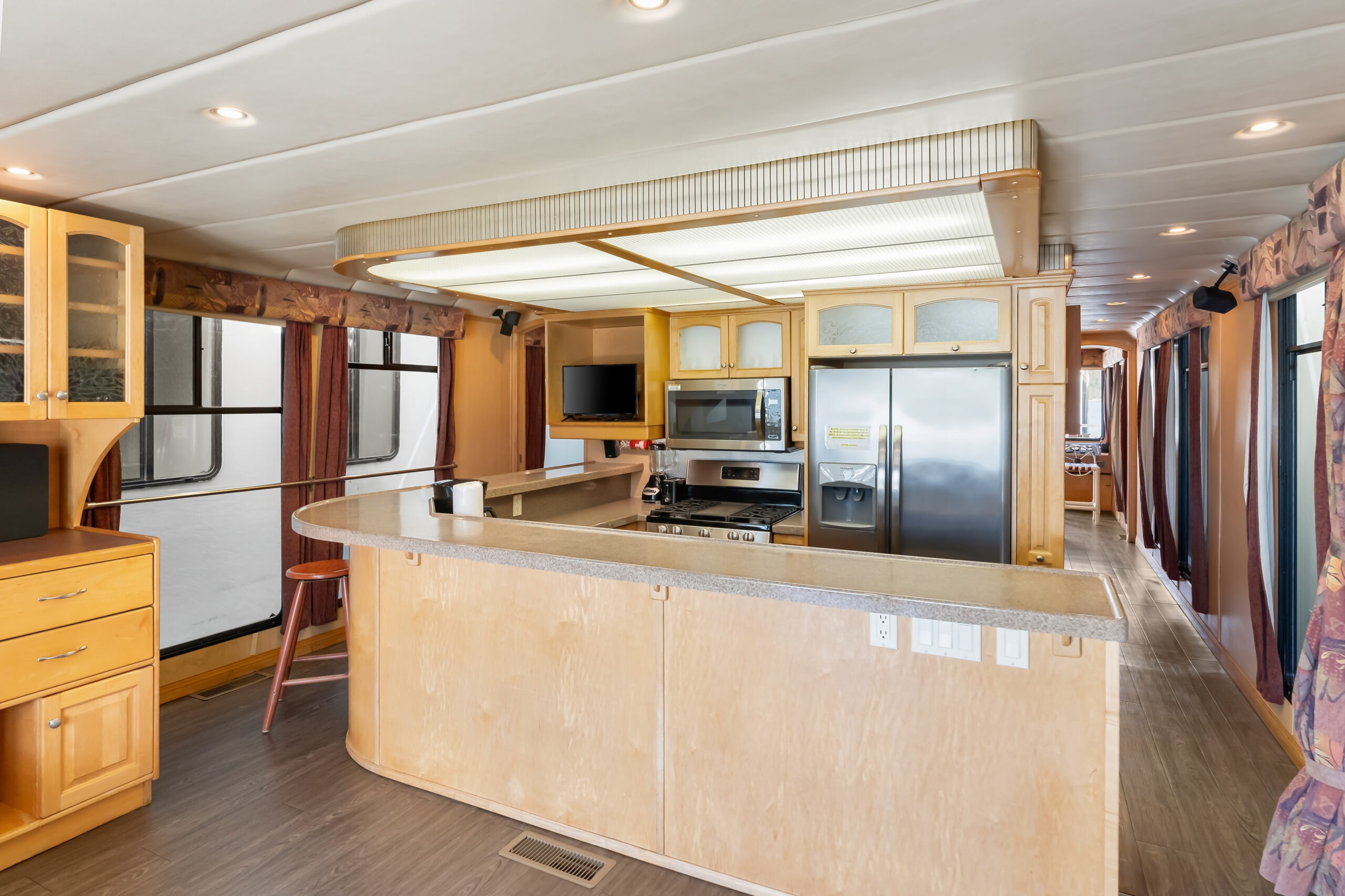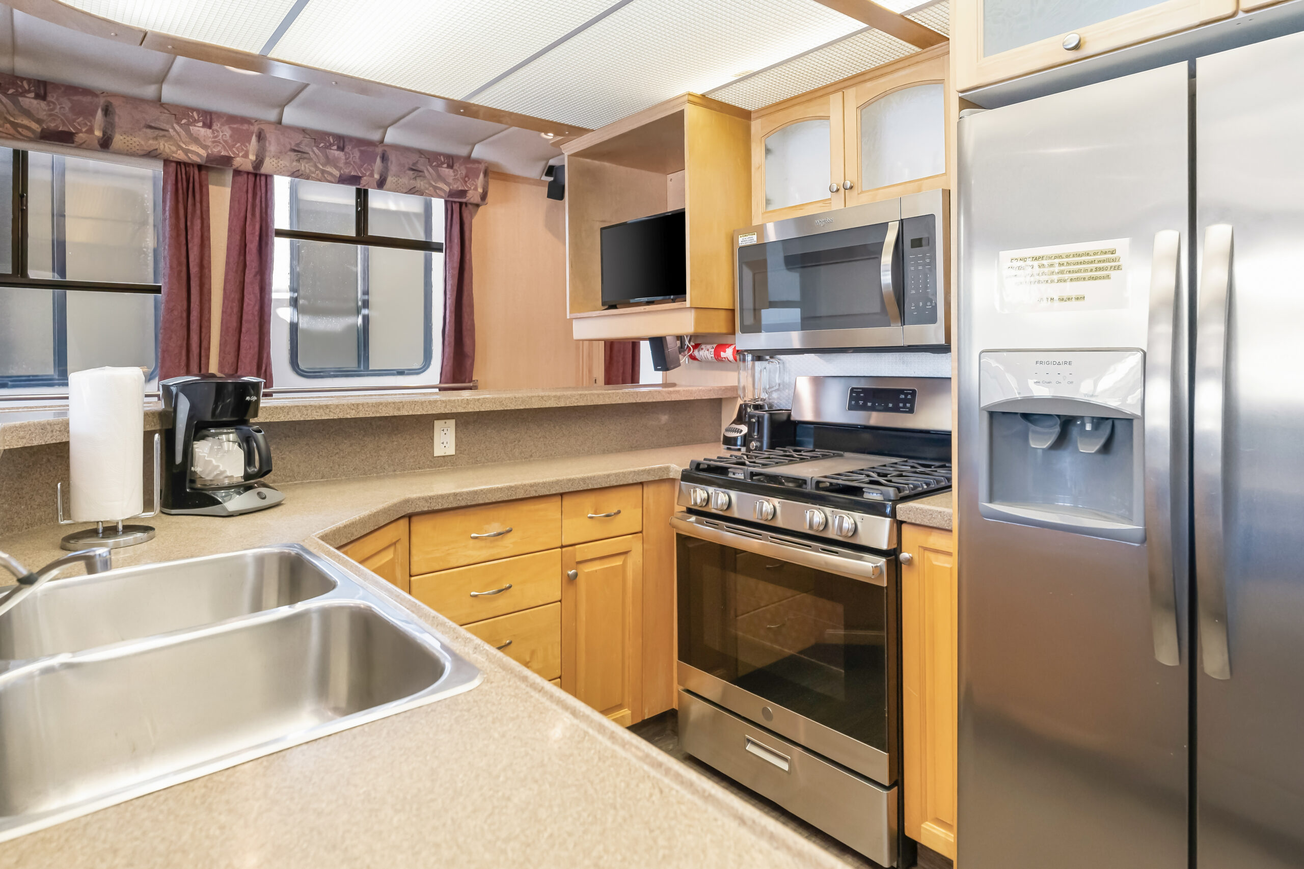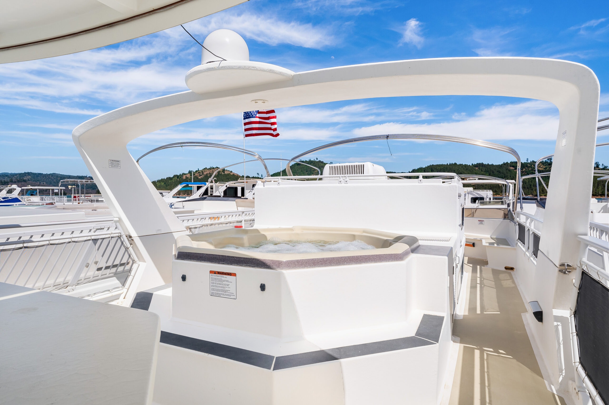 Imagine preparing a gourmet meal in a sunken galley equipped with sleek stainless steel appliances, while your loved ones enjoy the surround sound entertainment system. Upstairs, unwind in the hot tub with panoramic views of Shasta Lake, or savor a barbecue under the stars on the spacious upper deck. The Corinthian’s state-of-the-art entertainment system and tracking satellite TV ensure everyone is entertained.