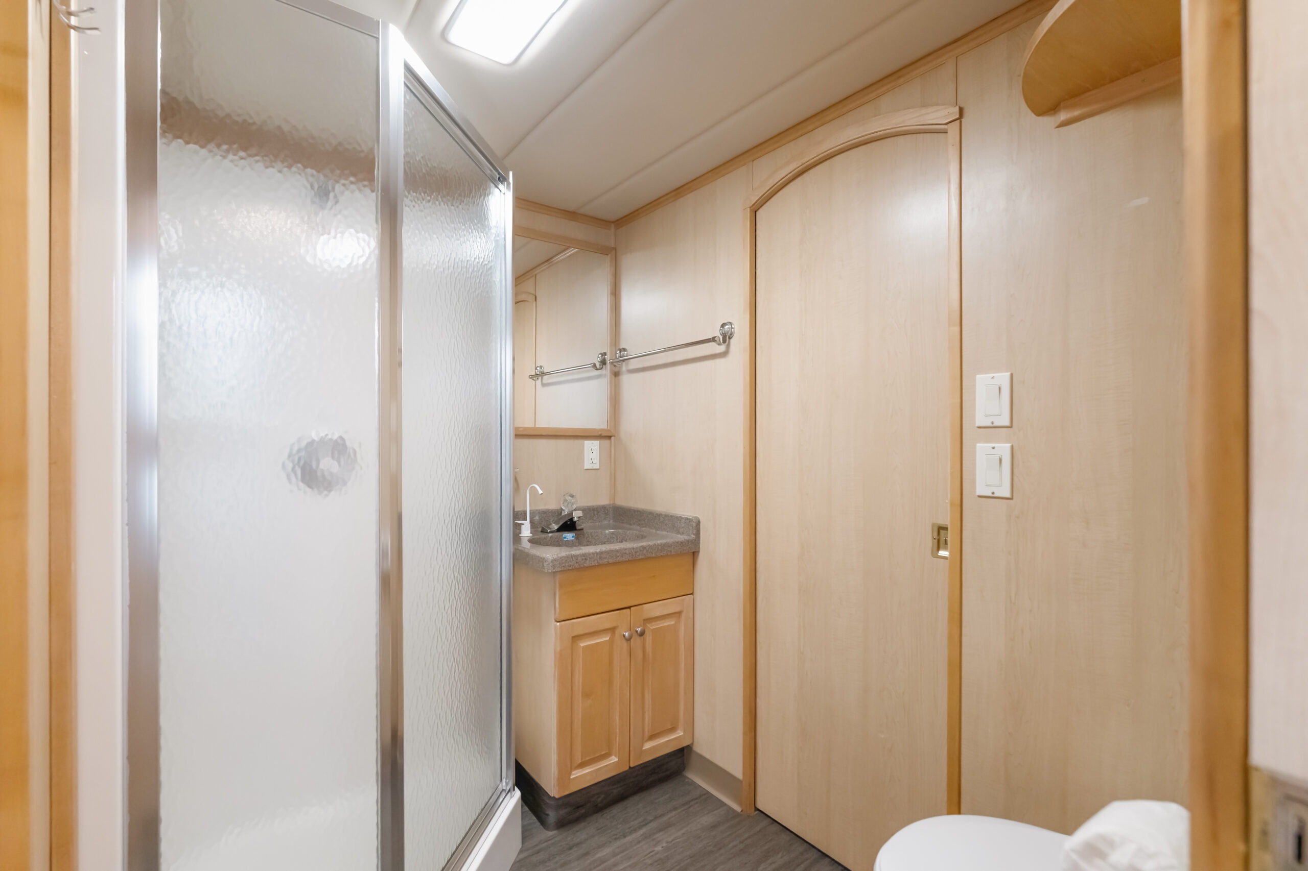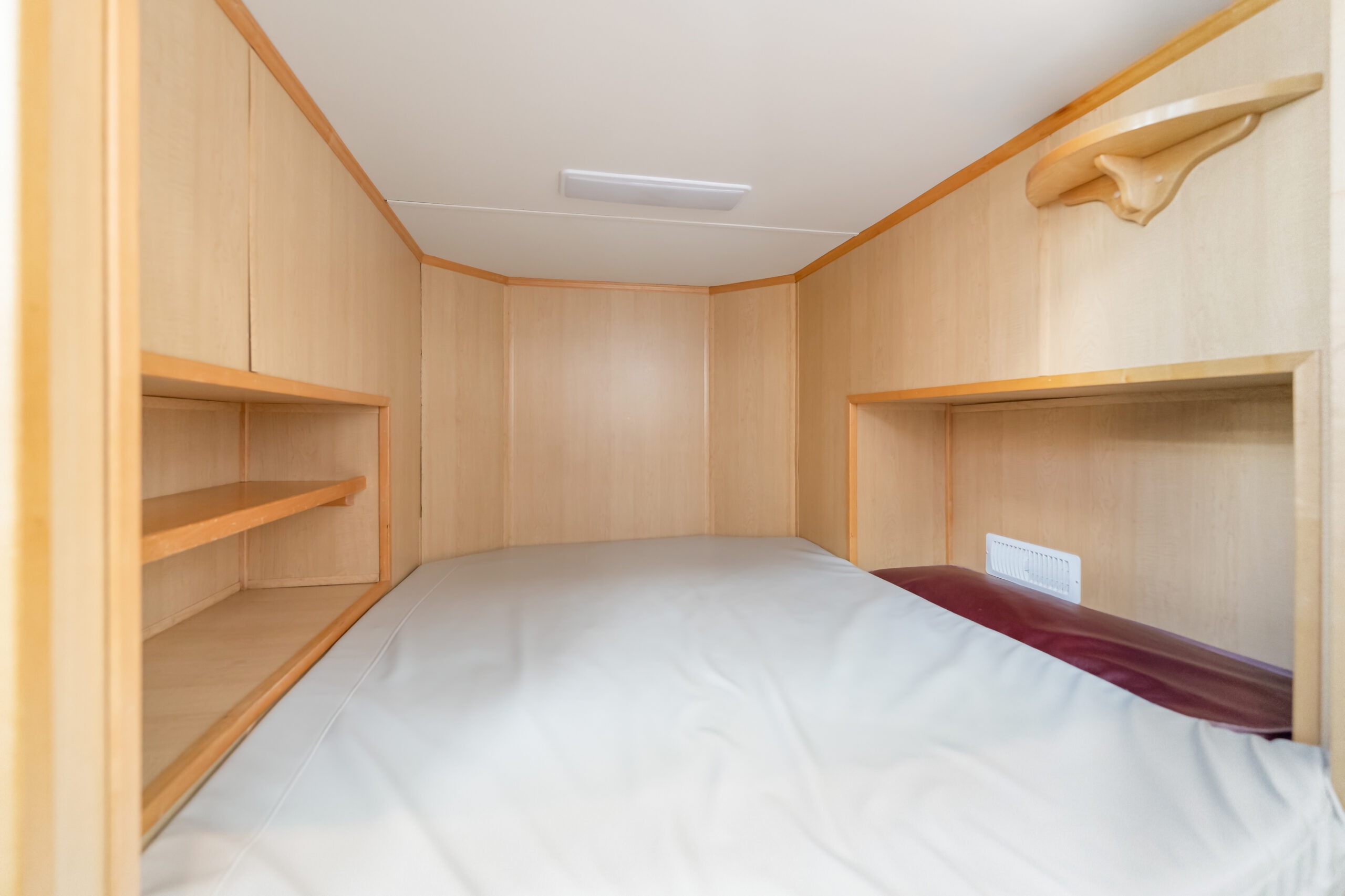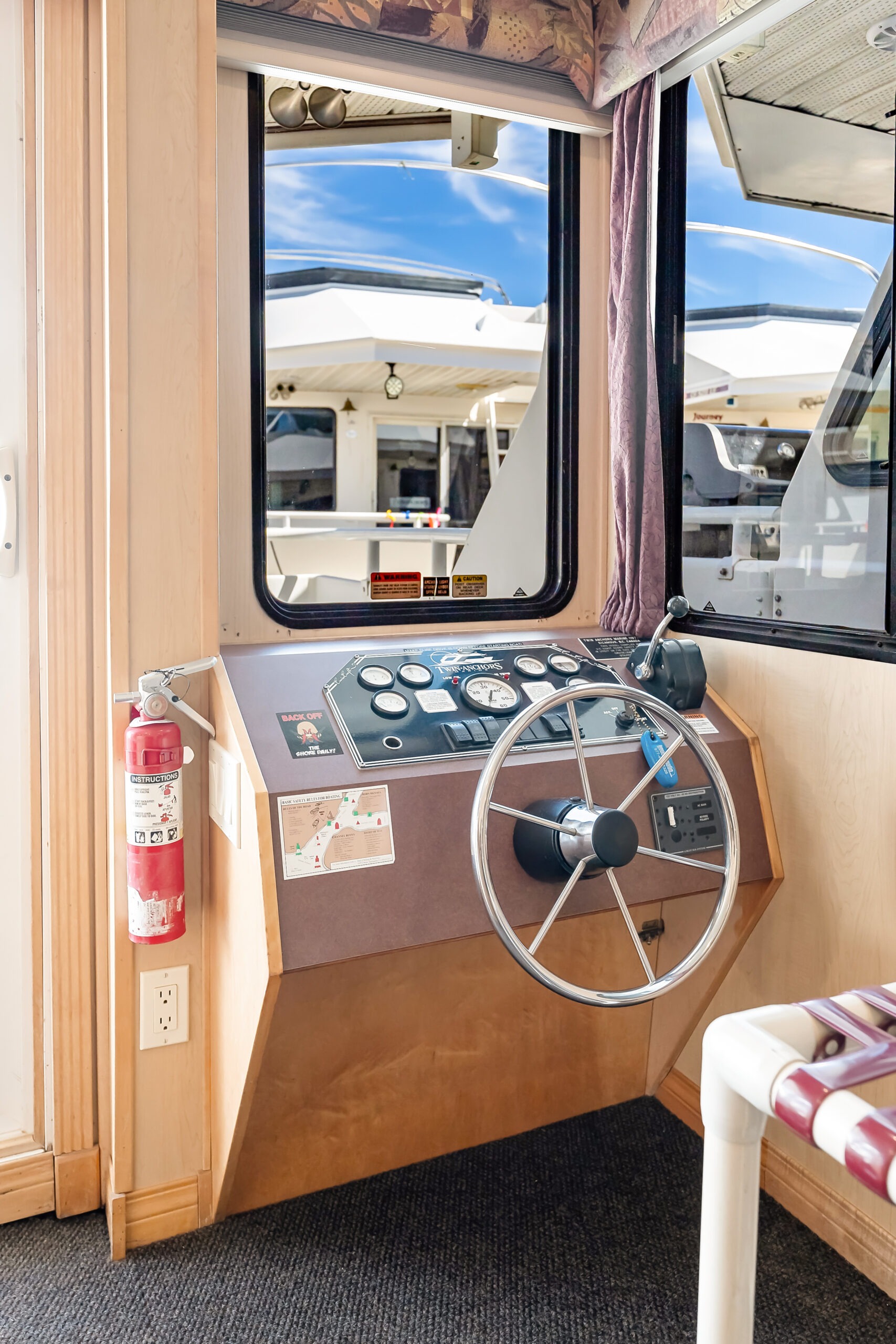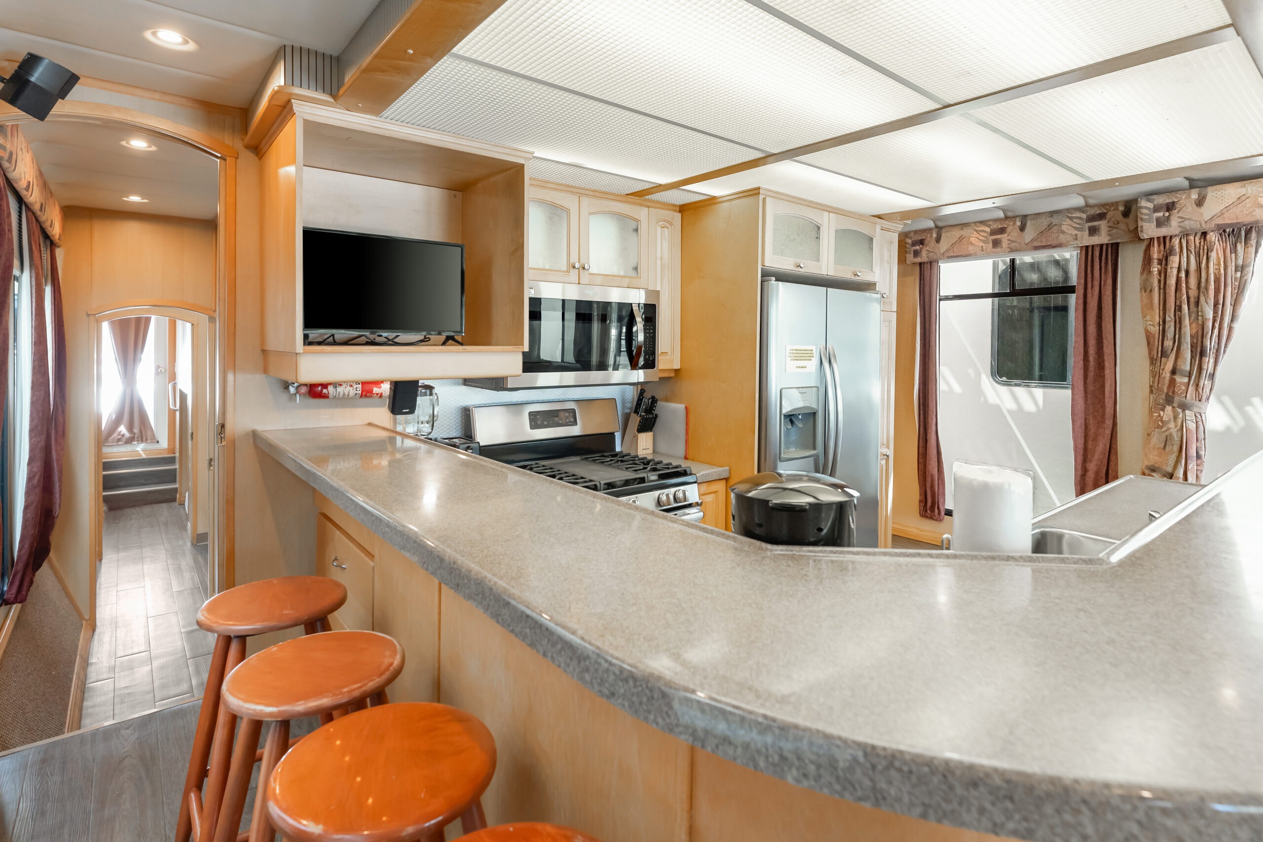 Imagine preparing a gourmet meal in a sunken galley equipped with sleek stainless steel appliances, while your loved ones enjoy the surround sound entertainment system. Upstairs, unwind in the hot tub with panoramic views of Shasta Lake, or savor a barbecue under the stars on the spacious upper deck. The Corinthian’s state-of-the-art entertainment system and tracking satellite TV ensure everyone is entertained.