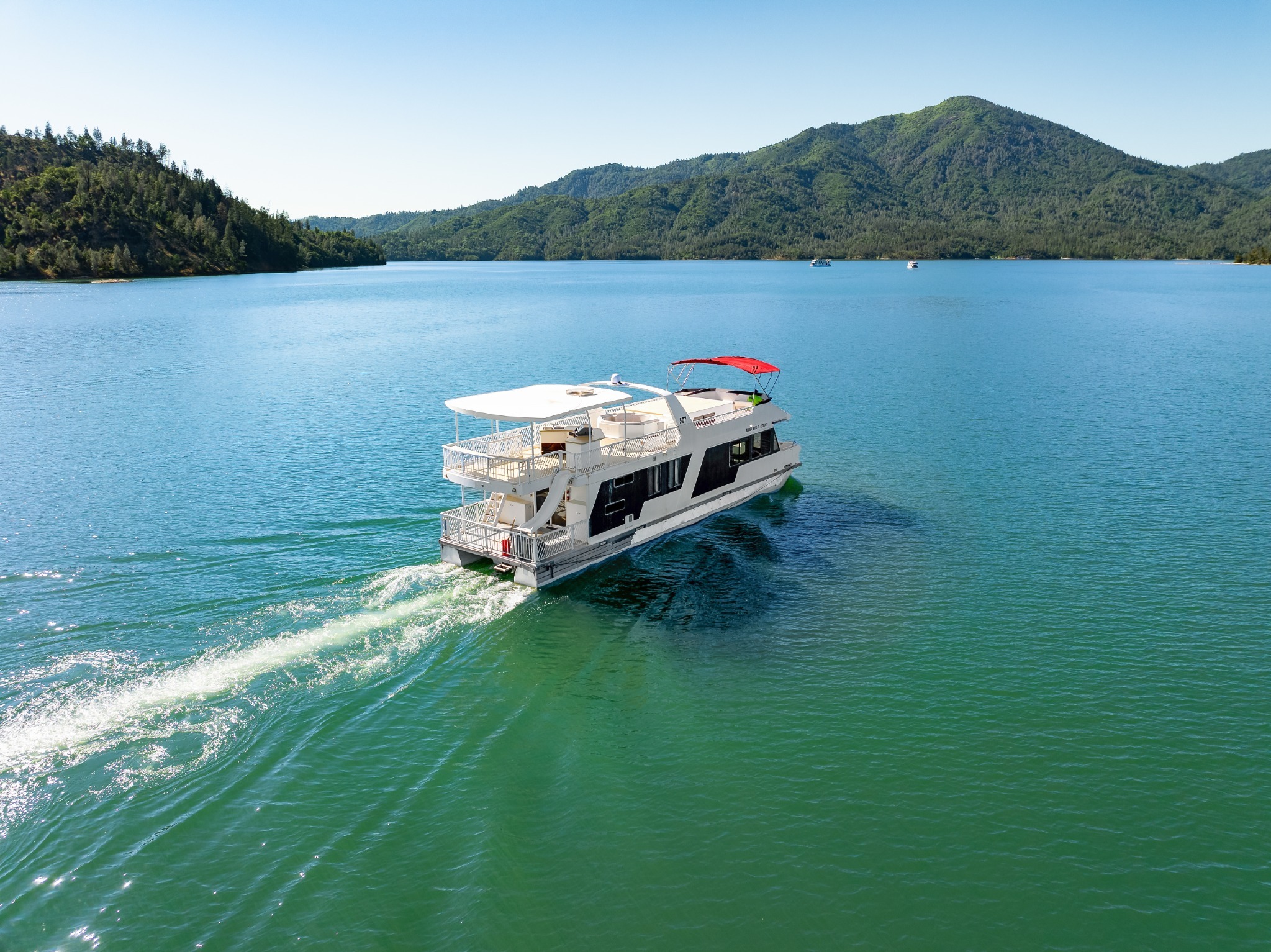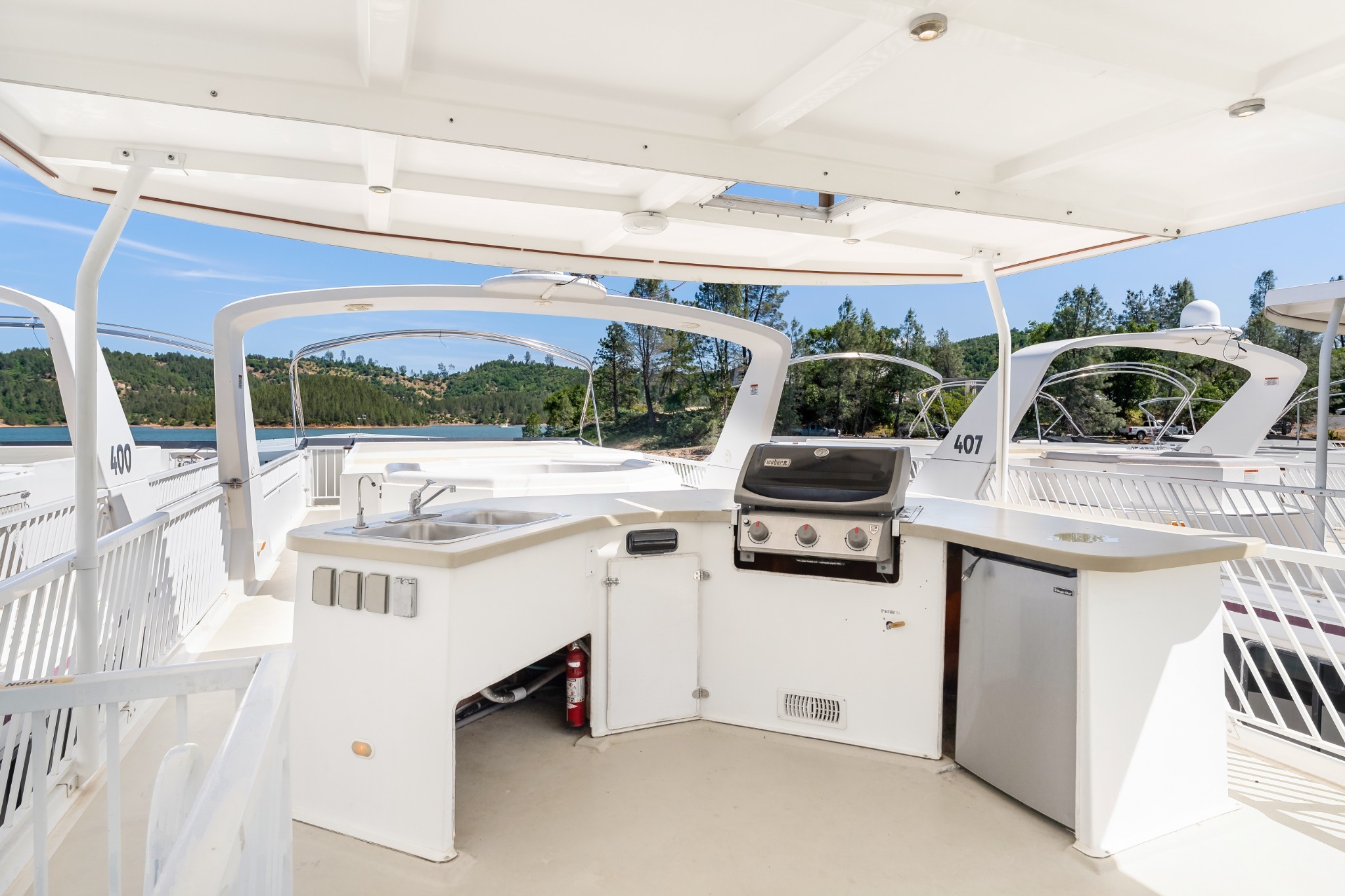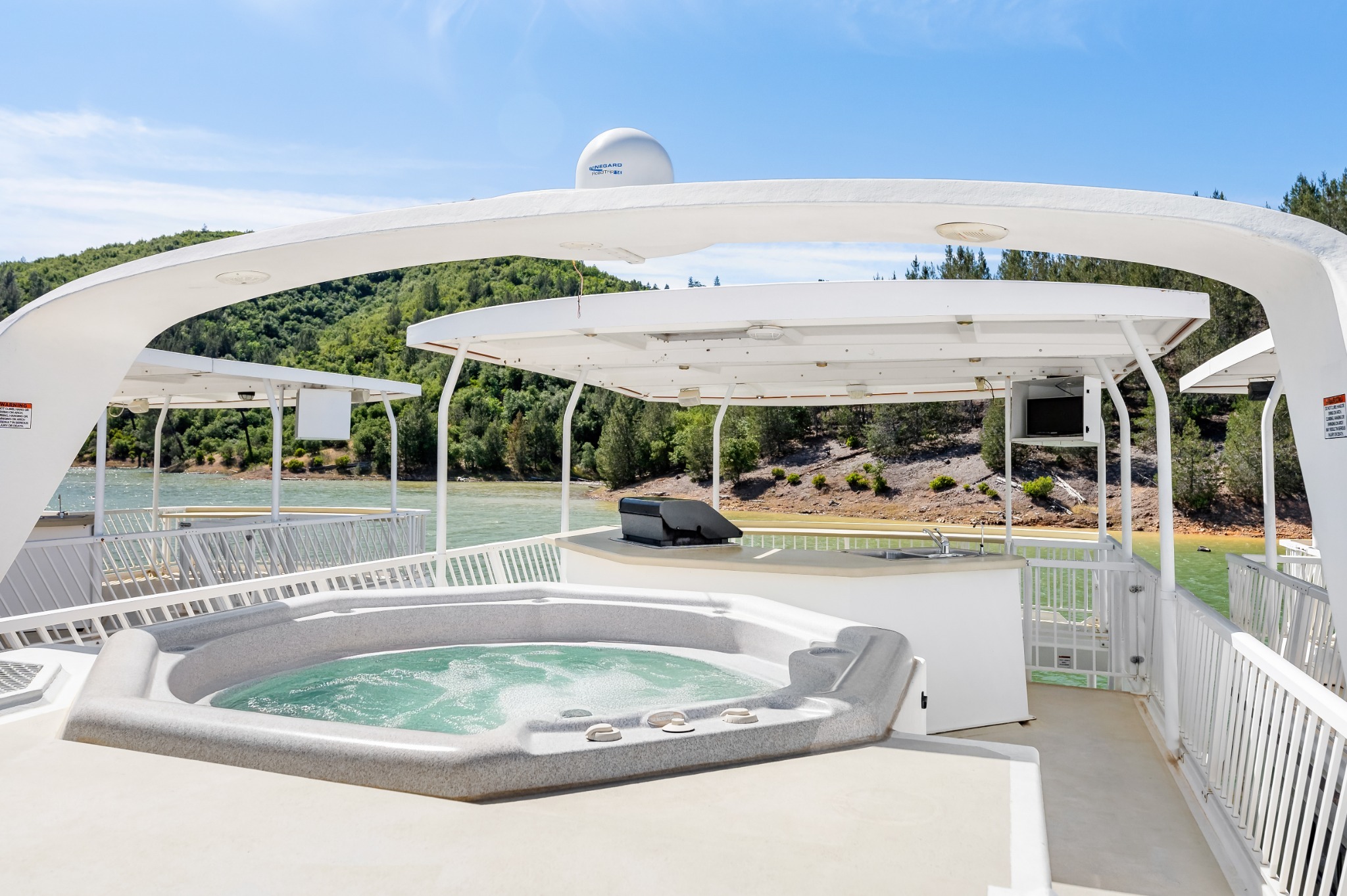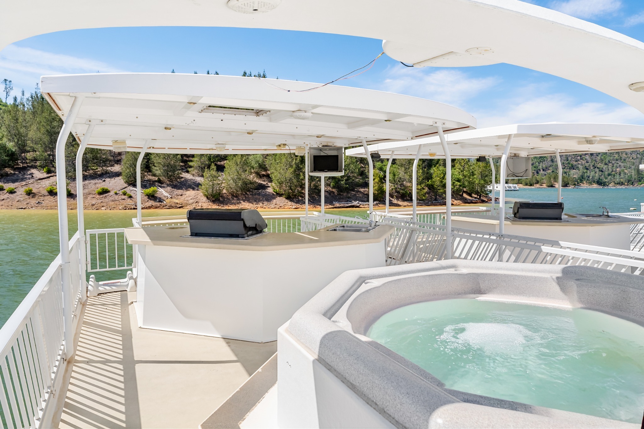 On the upper deck, you’ll find a 6-person hot tub, waterslide, outdoor TV, observation counter, and a second galley with a BBQ and fridge, all shaded by a fiberglass hardtop with ceiling fans. Whether you’re cooking, relaxing, or taking in the view, the Escapade ensures a memorable stay on Shasta Lake.