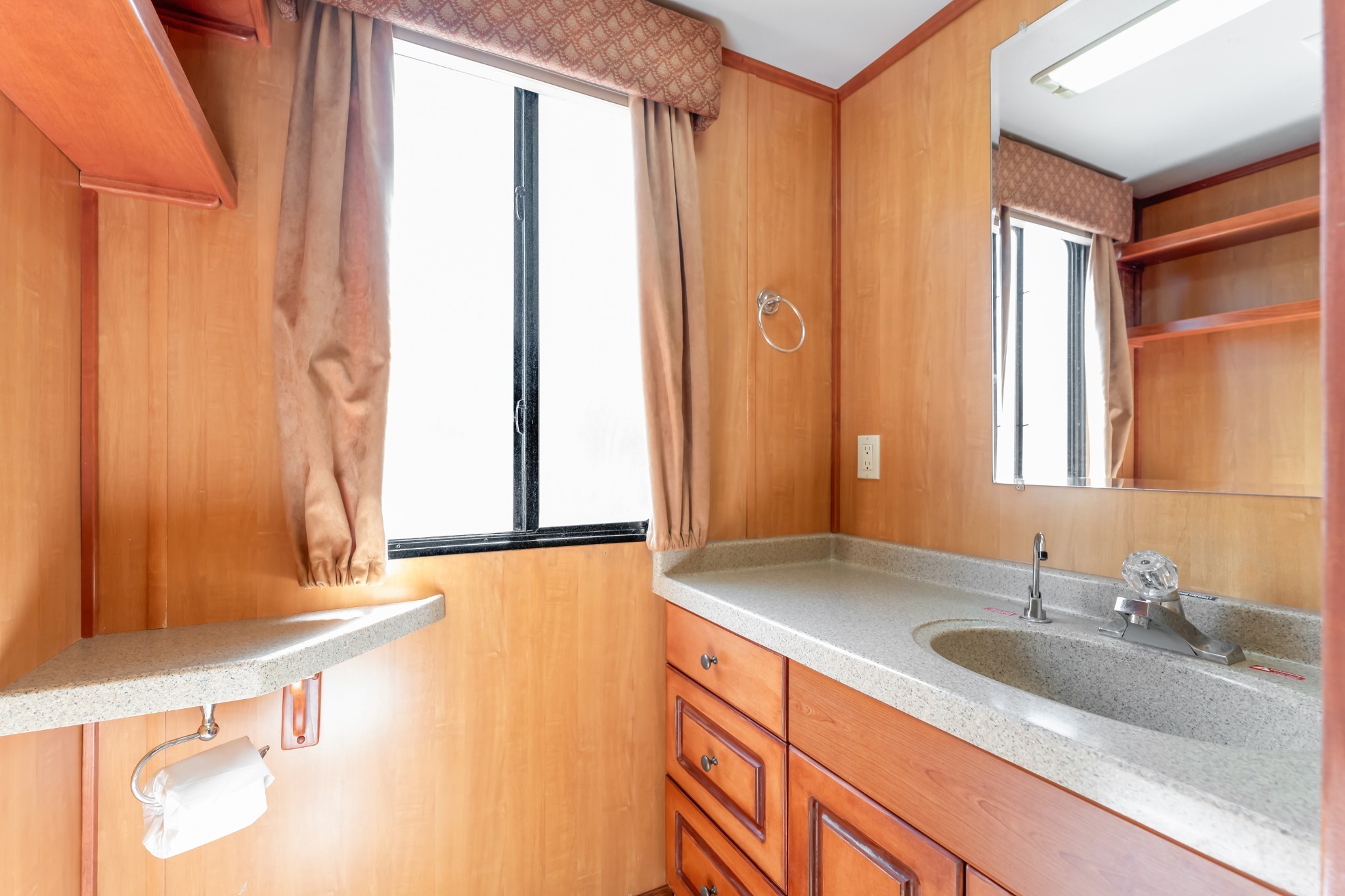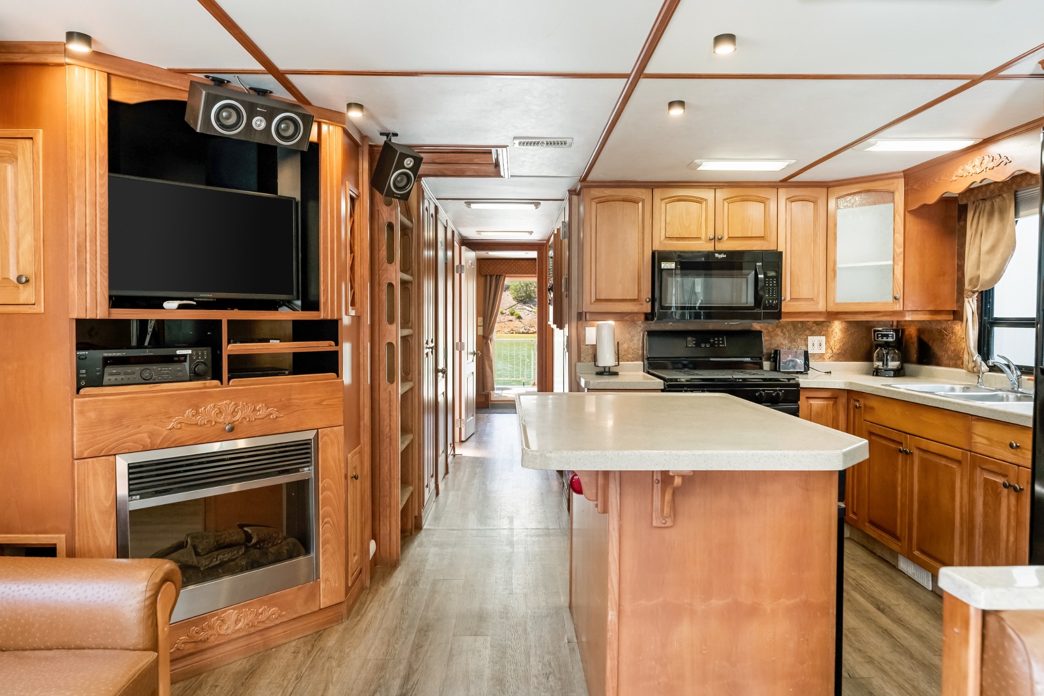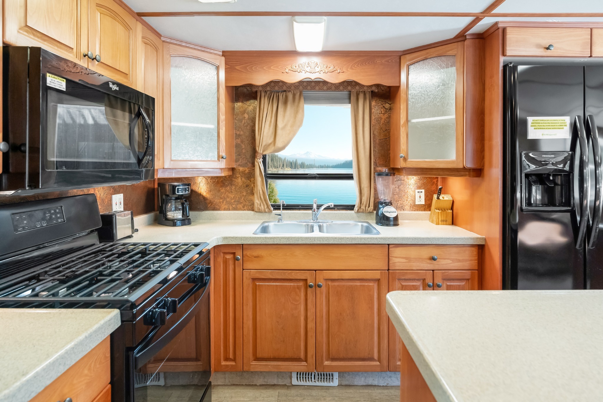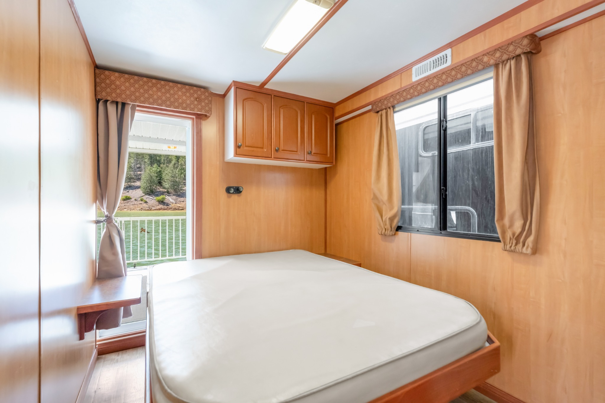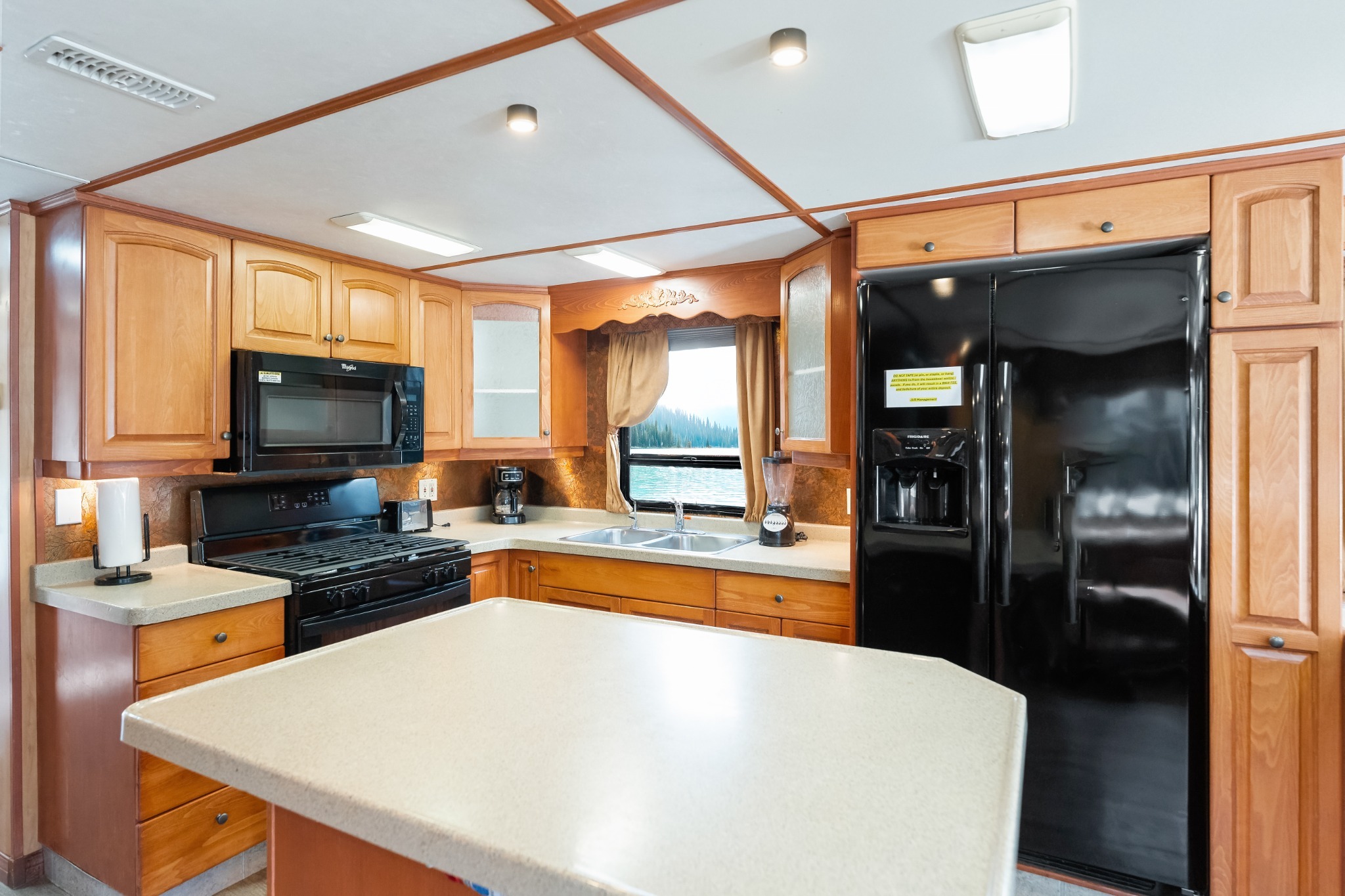On the upper deck, you’ll find a 6-person hot tub, waterslide, outdoor TV, observation counter, and a second galley with a BBQ and fridge, all shaded by a fiberglass hardtop with ceiling fans. Whether you’re cooking, relaxing, or taking in the view, the Escapade ensures a memorable stay on Shasta Lake.