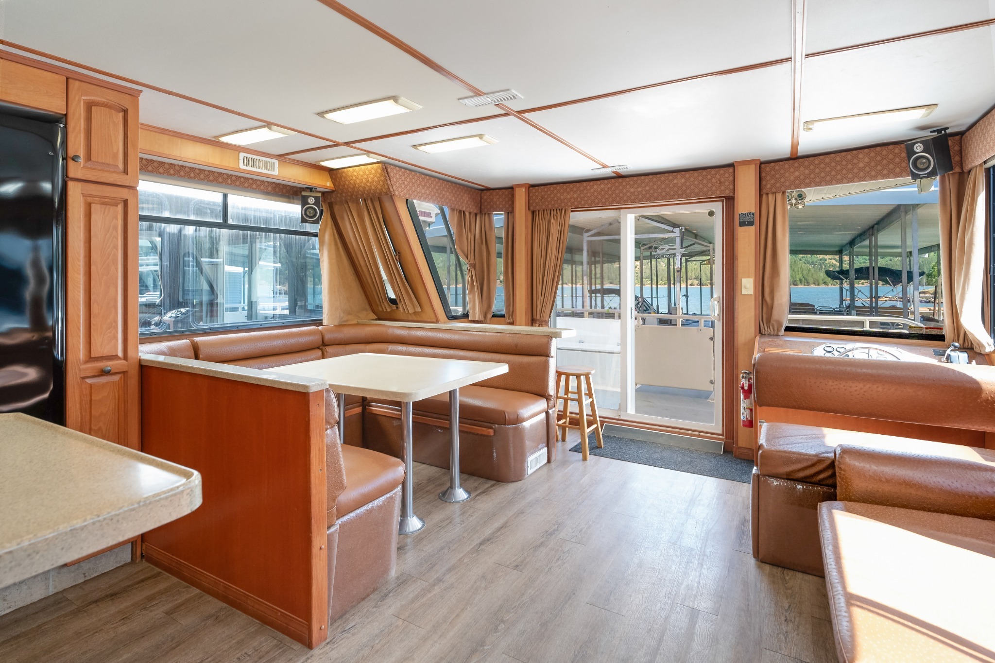 The Escapade Houseboat offers the ultimate blend of luxury and adventure. Equipped with a Home Theater Sound System, DVD player, and satellite TV, this houseboat creates an immersive entertainment experience. The elegant main salon features a cozy faux fireplace, while two private staterooms, a convertible couch, and dinette provide ample sleeping options. With space for up to 19 guests (sleeps 15 comfortably), the Escapade is perfect for large groups.